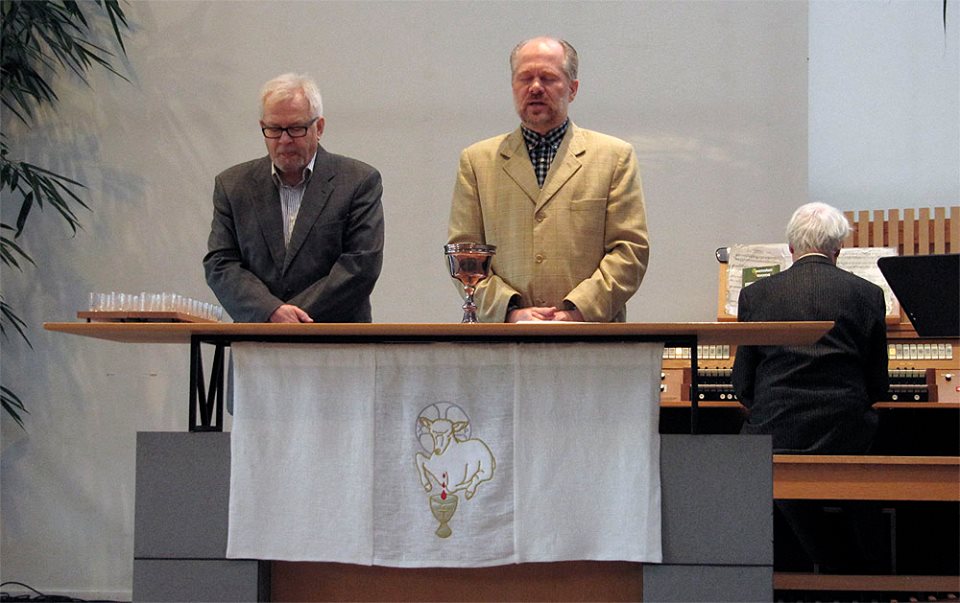 Jouko ja Marko ehtoollisen valmistelussa. Taustalla Rauno uruissa.